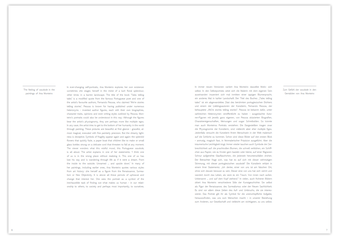 The catalog “Tales telling tales” is published on the occasion of the exhibition of the same name by Ana Monteiro from November 29, 2024 to February 14, 2025 at Galerie Schwind Berlin. It shows the current works of the Portuguese artist. A short text in English and German introduces the booklet. The picture panels are complemented by exhibition views.